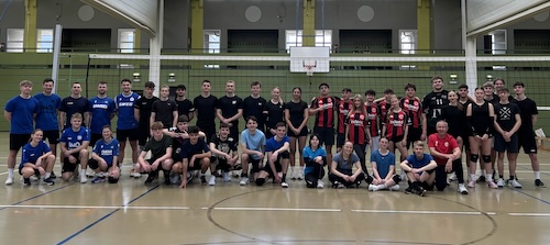 Auch gegen andere Schulmannschaften konnten sich Volleyballer vom LMG in diesem Schuljahr behaupten. Als großen Erfolg dürfen wir die erfolgreiche Qualifikation unserer Wettkampfmannschaft U23 bei „Jugend trainiert für Olympia“ vermelden. Am 11. Dezember 2025 qualifizierte sich unser Team souverän bei der Vorrunde und durfte somit unsere Schule am 27. Januar 2026 auf Regierungspräsidiums-Ebene vertreten, wo unsere Spieler der Oberstufe einen guten vierten Platz erreichen konnten und somit denkbar knapp den Einzug ins RB-Finale verpassten. Das Bild zeigt die Teilnehmer der Zwischenrunde in der Stadthalle Neuenbürg.