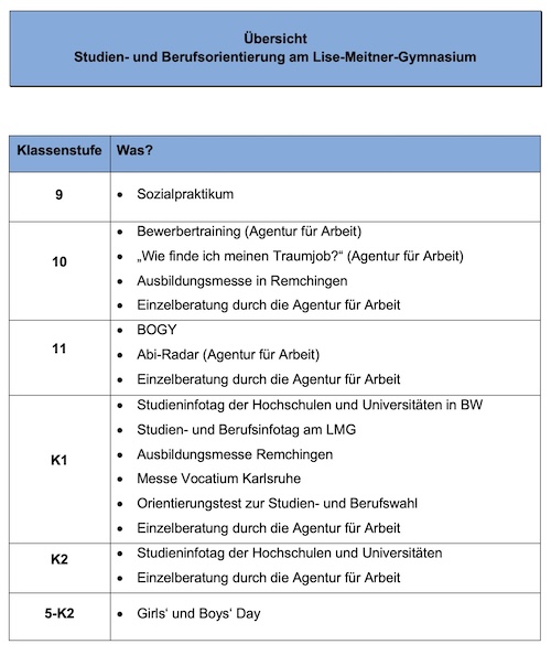 • Der Berufs- und Studieninformationstag für die Kursstufe 1 findet am Lise-Meitner-Gymnasium immer im Abiturzeitraum statt. Referenten aus verschiedenen Bereichen von Bildung, Forschung bzw. Ausbildungs- und Arbeitswelt stellen die Anforderungen und Berufsperspektiven in den jeweiligen Fachrichtungen vor und beantworteten Fragen. Es werden sowohl allgemeine Themen, wie z.B. Bewerbung, Zulassungsverfahren und Studienfinanzierung, als auch konkrete Ausbildungsmöglichkeiten präsentiert.