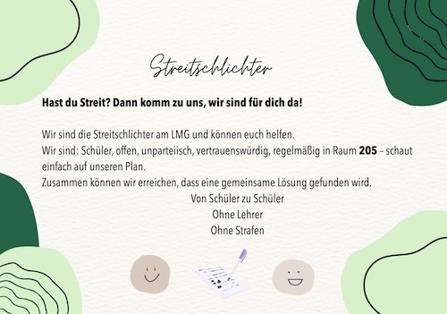 Unsere Gesprächszeiten und weitere Infos findet ihr an unserer Pinnwand beim Lehrerzimmer und an der Tür des Streitschlichterzimmers 205.